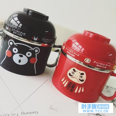 有通红和黑色两款,形象分别是呆萌的桃子君和更加呆萌的熊本熊。中间有一个放菜的加成,便当盖子同时也是泡面碗。提手的设计让它更加适合拿放,杯底采用防滑设计,使用起来更加安全。 — ❹ —