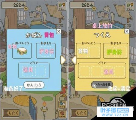这是一个小户型 loft 公寓。底层是蛙蛙的起居室,一桌一椅一柜,可以说是非常简单了,因此也有人说这只蛙蛙过的是「修道」的生活。 沿着云朵型的旋转楼梯往上就来到了阁楼,这里有蛙蛙蓝色的小床和书卷。 啊哈,还是一只爱看书的蛙蛙呢。 在《旅行青蛙》里,你要做些什么? 玩家在这个界面,能做的事情只有一件,那就是准备蛙蛙外出的行囊——左下角,原木色的按钮打开就是了。 蓝色的放置界面代表行李,里面放满食物、护身符、道具后,蛙蛙就可以出去旅行了。往右滑动,黄色的界面代表在桌面准备物品,为蛙蛙下一次旅行做准备。
