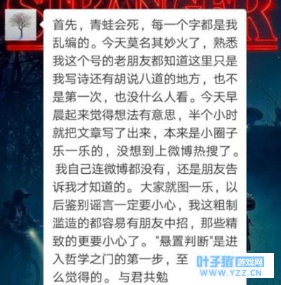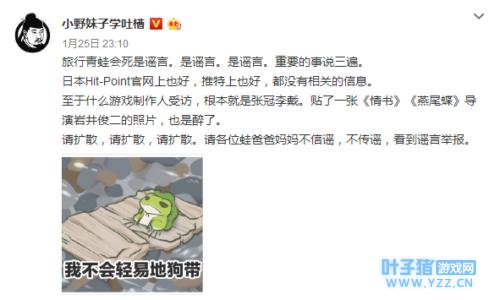 著名微博博主小野妹子学吐槽就在微博发文辟谣,微博原文如下: 旅行青蛙会死是谣言。是谣言。是谣言。重要的事说三遍。 日本Hit-Point官网上也好,推特上也好,都没有相关的信息。 至于什么游戏制作人受访,根本就是张冠李戴。贴了一张《情书》《燕尾蝶》导演岩井俊二的照片,也是醉了。 请扩散,请扩散,请扩散。请各位蛙爸爸妈妈不信谣,不传谣,看到谣言举报。