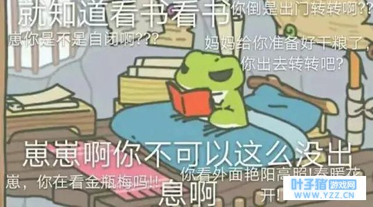 蛙真的去看书了,又说: 一天到晚就知道看书,你倒是出去走走啊。