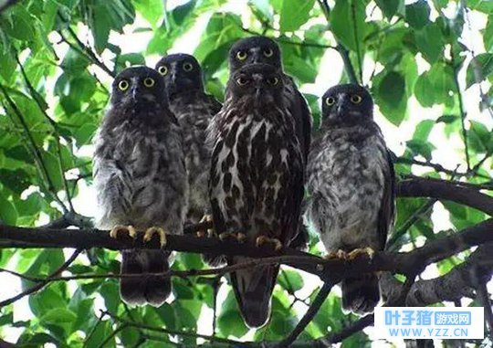 本尊(家长和四个孩子)。图片来源:https://plaza.rakuten.co.jp 北鹰鸮是夜行性猛禽,猫头鹰的一种。 大多数鸟类都是三趾朝前,一趾朝后,但猫头鹰们有一趾可以转动,可以从三前一后转变为两前两后,方便抓握。 同成鸟相比,一般鹰鸮的幼鸟们才喜欢挤在一起,它们腹部羽毛的纵纹要比爸爸妈妈们模糊不少呢。 ⑤ 呱蛙子心声:还好我有鼠兄,亲戚间能打个折吧!