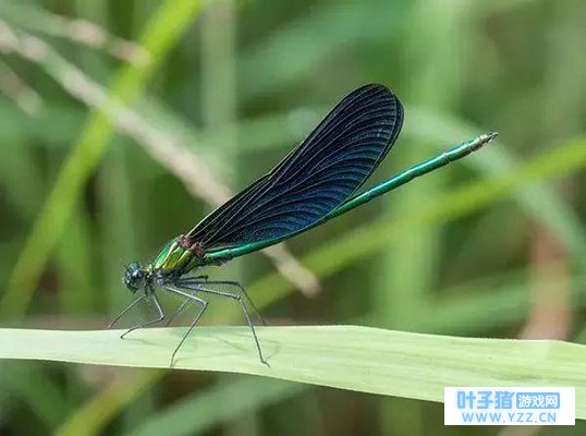 广斧螳本尊。图片来源:https://hiveminer.com/Tags/hierodula%2Cpatellifera 明信片画中腹部较宽的就是它啦! 日本色蟌 · 拉丁名:Calopteryx japonica · 节肢动物门-昆虫纲-蜻蜓目-日本色蟌
