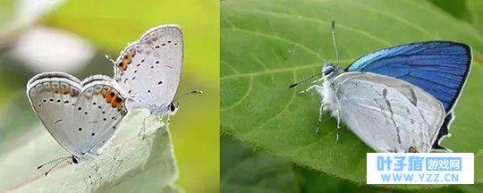 左:蓝灰蝶;右:艳灰蝶本尊(注意本尊艳灰蝶后翅内侧无斑点,可以与其他的常见灰蝶区分,原作中后翅内侧也无明显斑,至于那个红斑,就当被挡住了吧)。图片来源:http://blog.yohbo.main.jp/?eid=905330 艳灰蝶的背面具有大面积亮蓝色,镶有黑边,十分夺目,与明信片中几乎一样。 ④ 呱娃子心声:同样是宝宝,为什么它们那么大?