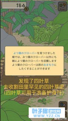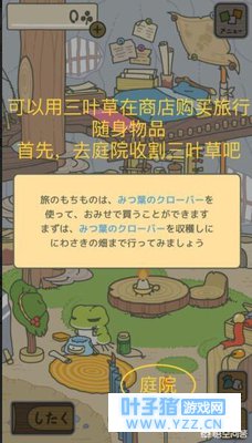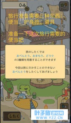 游戏主角就是一直可爱的小青蛙啦,进入游戏,会让你给他取名字。然后手机三叶草(游戏货币)去商店换东西,有食物,幸运符,还有帐篷等道具。然后你给青蛙把东西准备好了,它就会出去旅行,然后旅行的途中会给你寄照片,回来的时候还会给你带来当地的特产。