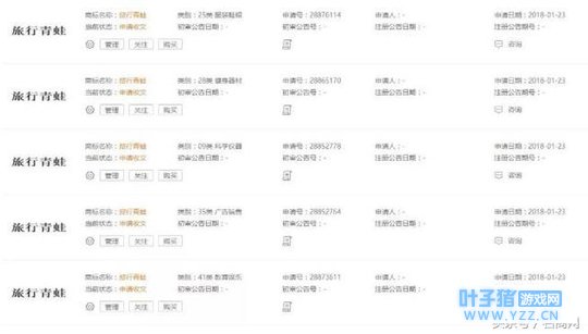 凭着职业敏感性或者说好奇心,小编商标检索了 “旅行青蛙”, 结果发现已有人于1月23日,率先申请注册了“旅行青蛙”商标,只花了区区1500元就承包了09类 网络相关、25类 服装鞋帽、28类健身器材、35类 广告销售、41类 休闲娱乐的商标申请。那么是谁这么快,在该游戏风靡朋友圈之际抢占先机。是该游戏开放商HIT-POINT公司?还是又一起恶意抢注?
