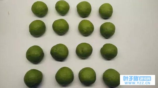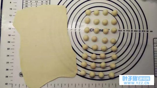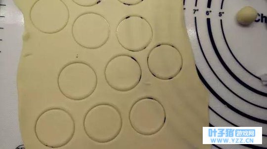 9、之后分出16个3g的小剂子做青蛙的眼睛,滚圆备用。剩下的欧克皮面团用擀面杖擀开; 10、找一个合适大小的圆圈,切割出几个圆形面片;