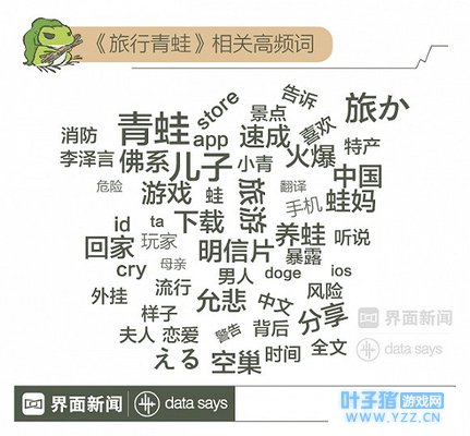 原因3:养蛙,养娃? 从上文不难感觉出,《旅行青蛙》的另一个高明之处在于,它模拟了现实中的亲子关系,将“儿行千里母担忧”和“空巢青年佛系生活”的情境描绘地十分生动;加上汉语中“蛙”和“娃”的发音十分相近,所以中国玩家对这款游戏的情感共鸣尤为强烈。 知微事见监测数据显示,在与《旅行青蛙》相关的热词中,除了“青蛙”和“旅行”外,“儿子”、“空巢”、“回家”等词汇出现的频次也非常高。