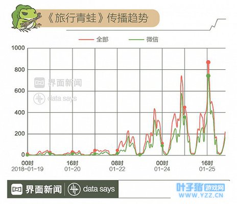 《旅行青蛙》在社交平台的传播势头也很猛。在1月21日《旅行青蛙》登顶App Store中国区免费游戏排行榜之后,《旅行青蛙》在中国各大社交平传播量激增,其中,微信用户贡献了绝大部分热度。