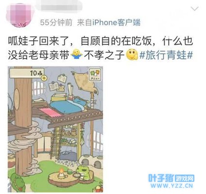 图片来源网络 「空巢青年」的自我投射:好像懂「作父母」的感觉了 当青蛙在家时,玩家的目标就是帮忙准备旅行的用品,如果准备好了,青蛙还赖在家里看书一下午不走,这些「呱爸」、「呱妈」还会着急:「也没要你考北大清华,别看书了,赶紧出门去啊!」很多玩家在青蛙不出门时,总是想着为什么青蛙还不出门? 但当青蛙离开时,这些当爸妈的玩家又开始心系青蛙儿子了:「怎么都四天了还没消息?」、「青蛙都不回来了。」、「不知道有没有在外面交到朋友。」就这样,担心的呱爸呱妈没地方抒发自己的担心,开始在微信微博上晒蛙碎碎念,表达对自己蛙儿子的思念,如同滚雪球般,吸引数以万计的青年投入这个养蛙风潮。 很多媒体观察到这种十分奇怪的现象,开始一系列从各种角度观察的评论,从这个游戏里面的明信片场景到底在哪,到为什么中国发达的游戏产业下做不出这种「小清新」游戏,最后导引到各种针对当代中国社会的评论纷纷出炉。 许多玩家提到,经过这款游戏,才了解家乡老爹娘的思维逻辑:小青蛙还会常常给家里寄些东西,让呱爸呱妈知道自己去了哪里,反观玩家自己可能离家两、三年,平常也不会特别传讯息跟父母说近况,爸妈打电话来还嫌烦。而这些青年在养蛙的过程中,体会到青蛙在家的时候,总是希望他能出去闯荡,帮他准备好各种旅行用品;然而当青蛙离开时,又时时挂念青蛙儿子在外面的情况─ ─这简单的小游戏,让许多青年开始学会怎么「做父母」。