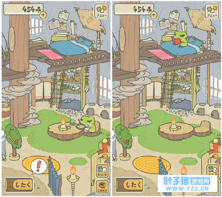 所以这个游戏到底玩什么呢? 生活在你手机里的,是一个个有个性的自主小动物,这个屏幕呈现的是它生活的一部分而非全部,没有出现在屏幕里的,可能是它所存在的更广阔天地。从小青蛙发回来的一张张照片,我们可以猜测它去了哪里,做了什么,在路上它也如此自由,去过的地方比我们还要多,比我们更懂享受一个人旅行的乐趣。 旅行青蛙游戏怎么玩 基本玩法: 游戏的主界面有两种:一个是庭院にわさき,一个是呱的房间おうち。