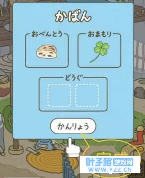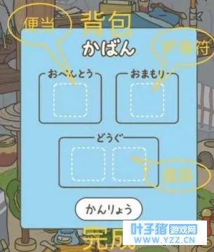 【整理背包】背包由三个部分组成:おべんとう(便当)おまもり(护身符)どうぐ(道具)按照图片指示整理好背包点击「かんりょう」(完成)就好啦。