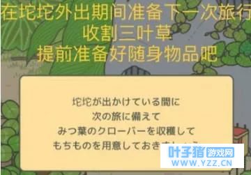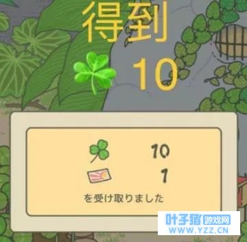 【旅行归来】收到提示后进入游戏,坨坨带回来两种礼物:当地特产物品(分为稀有级别和普通级别)、照片还会收到旅行奖励:三叶草和一张东西P.S.我也不知道那张是什么东西,所以没有标注,如果有知道的告诉我一下吧……