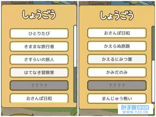 ❤1.称号:独自旅行(ひつりたび) 获取:初次旅行回来就可以获得了。 效果:减少照片中出现其他动物 ❤2.称号:漂泊的旅人(さすらいの旅人) 获取:带碗或者帐篷进行长时间旅行 效果:照片中更容易出现道具 ❤3.称号:无止境的冒险家/无目的的冒险家?(はてなき冒险家) 获取:猜测:带着2称号去旅行 效果:【还不确定】可能是无视方向的长时间旅行? ❤4.称号:随心所欲的旅行者(きままな旅行者) 获取:【不确定】之前猜测可能和包袱皮还有(抽奖)桃红色御守有关) 后来发现没这些道具的玩家也获得了这个称号 效果:可能是无视时间,有时候很快回家,有时候很久回家 ❤5.称号:散步的好天气(おさんぽ日和) 获取:带10草或者20草的食物,去温暖的地方短期旅行 效果:容易拍到树,海边,海边公路 ❤6.称号:不归之旅(かえらぬ旅路) 获取:旅行时间超过一天 效果:增加出门时间 ❤7.称号:求神保佑(かみだのみ) 获取:【不确定】可能是蛙蛙在家的时候抽三次奖 ,也可能是带着抽到的御守进行长期旅行,也可能是连续抽中3次以上奖 效果:可能会无视效果,甚至相反(比如带着耐热的食物反而去了北方) ❤8.称号:青蛙和三叶草 (かえるにみっ葉) 获取:【不确定】是某次收草时获得的,我猜可能是收草/收四叶草达到一定数量 效果:增加蛙蛙旅行带回来的三叶草数量(有时候多给十几个呢) ❤9.称号: 害怕馒头(まんじゅう怖い) 获取:【不确定】可能和用温泉馒头招待小动物达到一定次数有关 效果:还没测试出来