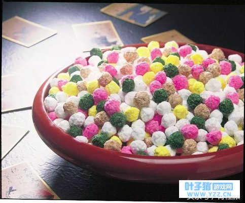 五色豆,就是将豆子染上不同颜色的糖衣制成。一共有白、蓝、红、黄、黑五种颜色,分别对应了五行:白为金、蓝为木、红为火、黄为土、黑为水,合起来便象征了大地。它是近畿地区京都的著名和果子。 瓦仙贝
