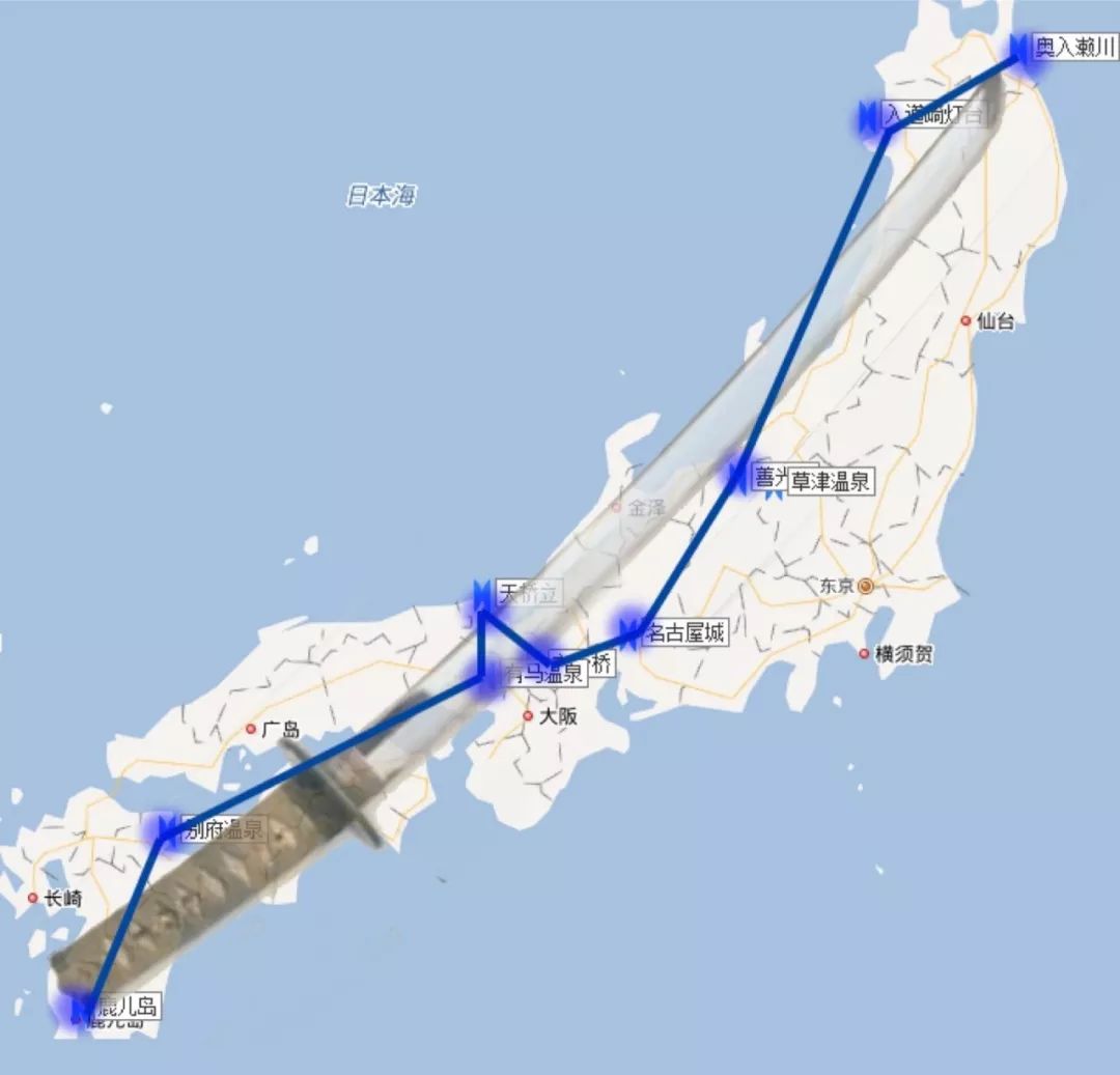 !空帮蛙的行迹遍布日本各地,而这些地点连起来,竟然是一把