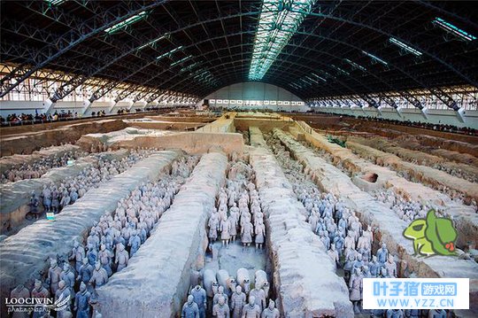 兵马俑是秦始皇的陪葬坑。兵马俑规模宏大,已发掘了三个俑坑,总面积大约有20000平方米,坑内有陶俑8000多个,由于地理环境和技术原因,还有很多是未曾发掘的,不少还是在修复当中,蛙儿子在俯视兵马俑现在身处的位置就是兵马俑一号俑坑的上面。
