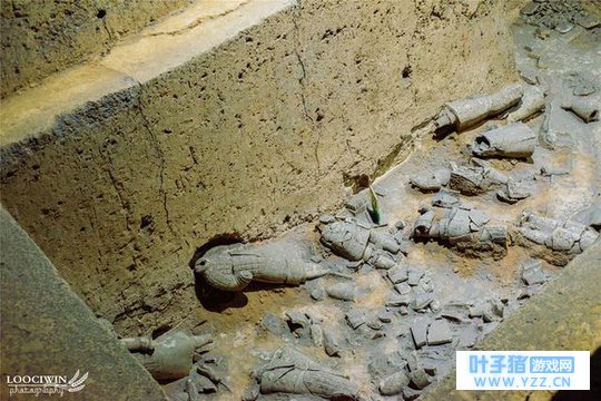 在另外一旁,可以看到地宫还没有复原的状态,兵马俑完全压碎,只成瓦砾,歪歪斜斜让人触目惊心。