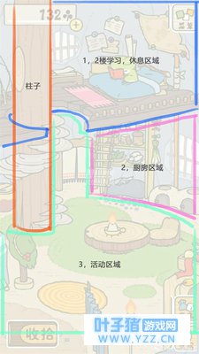 1,首先要分析原画中场景的功能划分,有利于安插自己的想法和新的功能划分,原图是一个双层复式结构,第一层主要是学习和休息区域,下面一层是活动以及厨房区域,如下图: