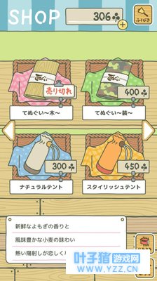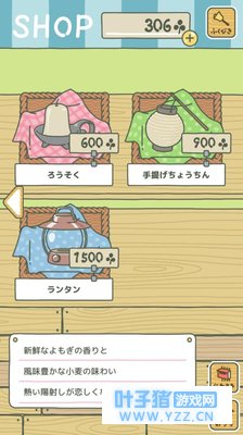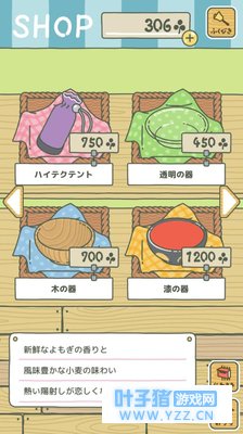 おみせ 小店(在里面可以购买呱娃子旅行用的物品) もちもの 随身物品(随身物品的数量越多越贵,回来的越快) 三つ葉(みつば) 三叶草(三叶草是用来购买随身物品的,每隔一段时间会在庭院里长出来) どうぐ 道具