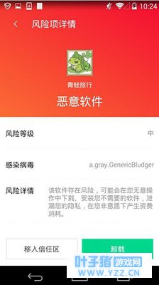 小王为了追赶朋友圈潮流决定尝尝鲜,但在下载养蛙游戏时却出了岔子。由于不懂日语,连续在应用市场搜索四五次依旧“找不到该软件”,养蛙心切的小王索性在手机网页上搜索“青蛙旅行”,没想到还真发现了一个下载弹窗,于是立马点击下载。小王满心欢喜完成下载,而现实却是手机屏幕不断弹出广告弹窗。 尽管在手机弹出广告后的10分钟内小王便卸载了该软件,但仍心有余悸。实际上,小张下载的并非官方正版软件,而是存在木马病毒的恶意伪造版。根据安全专家介绍,该病毒名为“a.gray.GenericBludger”,一旦启动,就会疯狂在手机屏幕上推送浮窗广告,不仅严重影响用户手机体验,还可能存在捆绑恶意软件的风险。