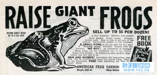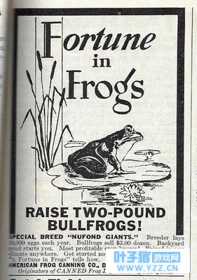 古代的蛙神崇拜,图片转自机核网 《聊斋志异》里就讲了个蛙神的故事: 据说,有些南方人特别崇拜蛙神。他们相信:只要触犯了神,家里就会爬满青蛙。 某地修关帝庙,当地人都集资出了钱,只有一个姓周的大富翁,承诺了给钱,就是吝啬着不肯掏银子,以至于工事迟迟不能完成。 某天,周富豪正睡午觉,突然听到门外有牛喘的声音。出门一看,一只超大的青蛙正堵着门。周某一看,青蛙这准是来讨债了,就说:我先捐三十金。 大青蛙一动不动。 周某接着加价,承诺把钱一次交齐,大青蛙就缩身成小青蛙走了。 后来,周某只交了一半的钱,就没管这事了。 没想到过了几天,大青蛙又来他们家了,这次还带了很多小青蛙。三天的功夫里,周某家里就爬满了青蛙。 周某这回怕了,赶紧又捐钱了,这大青蛙才肯走。 《聊斋志异》虽是戏说,却可看出蛙儿子在中国社会地位堪忧—— 本宝宝堂堂神仙,还要上门催债,容易么? 养蛙这件事真正的风靡,还得归功于美国人。 正如我国九十年代流行养虫草一样,1930年代的美国流行养牛蛙赚钱。 有个叫阿尔伯特·布罗尔的美国人,写了本养殖青蛙的书,还开设了自己的青蛙农场,他打出很多广告让人相信: 只需要一个小池塘,几对种蛙,你就能收获大大的财富梦想。