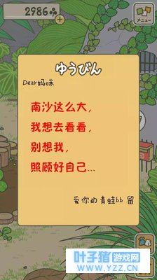 青蛙妈妈,我在外面过得很好, 不用太关心我的安全, 南沙这边很多好吃的,好玩的, 我打算多玩几天再走, 很快我就会回家的啦! 你不用太担心我哟!