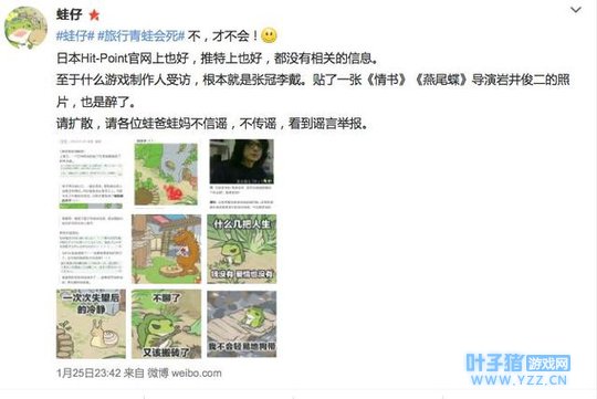 再次,造谣军是最不能闲着的,生生的把谣言推上微博热搜#青蛙会死#被吃掉,被碾死?各种意外,血腥肢解上图,然后记者采访,辟谣,然鹅提起来的心这才放下,不管浪多久,妈在等,终究我蛙还是会回来的,放心养!这不,那些蛙爸蛙妈们刚露出谜一般的老母亲老父亲招牌式的微笑,青蛙旅行的制作君又出来说话了,说一半留一半:我们原本产品的设计并不会让大家无限制的玩下去,这是神马意思,到底是会死还是不会?然鹅,很快又被爆出来,那个大框眼镜某并不是制作人啊,那是岩井俊二,算了,真相总会有,可惜渔妹也不知道(不好意思),那让时间证明一切吧。