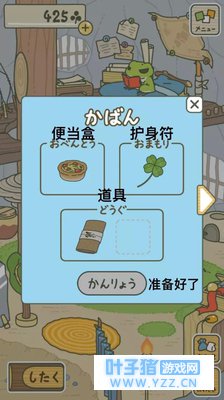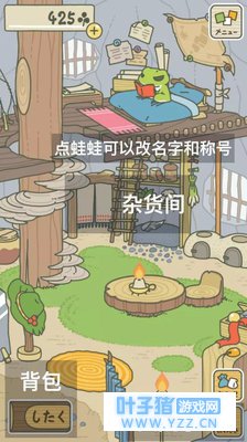 我们在这里可以看到它没出门时, 在家生活的日常。 点击蛙蛙我们可以修改它的名字和称号。 这个游戏中有许多称号, 如一个人的旅行、流浪的旅人、 没有目的地的冒险家……. 不同的称号获得方法途径是不一样的, 然而想要收集齐全并不是件简单的事情。 桌子和背包 点击左下角,我们可以为蛙蛙准备东西。蓝色的第一页是它的背包,按照种类分为了三个部分。便当是必须准备的,其它就看你自己的需要和财力了。