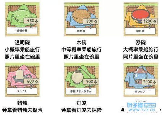 头巾是青蛙上街游玩时用的,帐篷适合它野营用,玻璃碗、木碗、漆碗都是它出门当船用的道具,而蜡烛和灯会鼓励你的蛙出去冒险。每种道具分三个级别,越贵的道具带来的行为发生概率越高。
