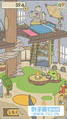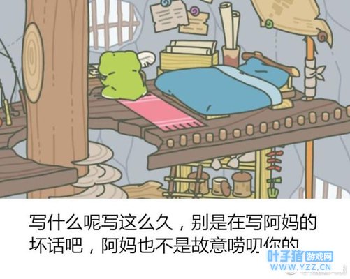 游戏设置的另一重要场景,那便是蛙蛙的家了。上下两层,结构简单。蛙蛙游满归来时,它饿了会在楼下桌前吃饭,吃饱可能做做手工,时而坐立床头读书,或伏案疾书。在家里,更多时候,你只能默默看着蛙蛙做自己的事,或者帮它准备好装有食物、护身符和道具的行囊打包后,等待下段旅程开始。