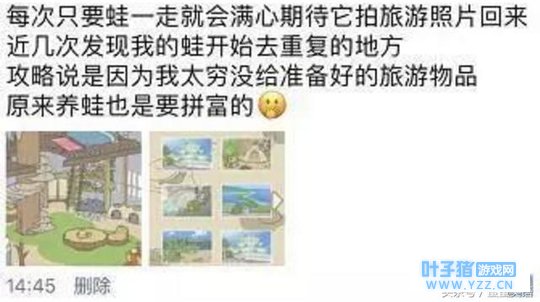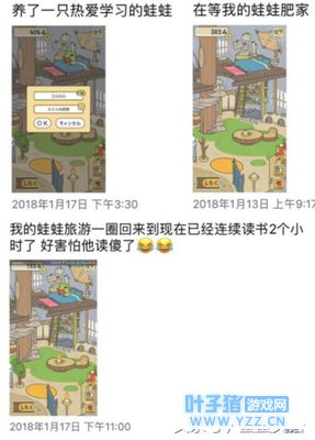 《旅行青蛙》 很多朋友开始玩这个游戏,然而一股养蛙跟风潮也就此袭来,朋友圈瞬间就“绿”了,各种喊儿子回家吃饭的段子层出不穷。