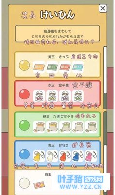 可以转出黄玉(黄色)、赤玉(红色)、绿玉(绿色)、青玉(蓝色)、白玉(白色)球球,每个颜色的球代表不同的事物。 金球:直通各方位的特殊车票,黄绿红蓝对应东西南北。 红球:星星状的糖果。 绿色:丸子 蓝球:护身符 白球:一张抽奖券