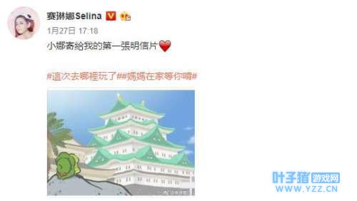 艺人Selina也发文跟粉丝分享她养的青蛙“小娜”寄来了第一张明信片,开心写道,“小娜寄给我的第一张明信片。#这次去哪里玩了#妈妈在家等你唷。”语气像极妈妈对小孩说话,让歌迷笑说她的爱犬Pinky失宠了。