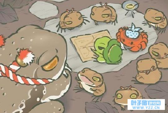 图五:蛙儿子和小红蟹、寄居蟹正在享用一场友谊的聚餐。