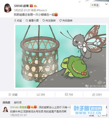 还有SNH48女团的成员们,赵粤发微博说她家小青蛙总是和一只小蝴蝶在一起,可能是来自老母亲的嫉妒吧23333 而同团成员易嘉爱则回复担心自己家的蛙有自闭症↓↓↓