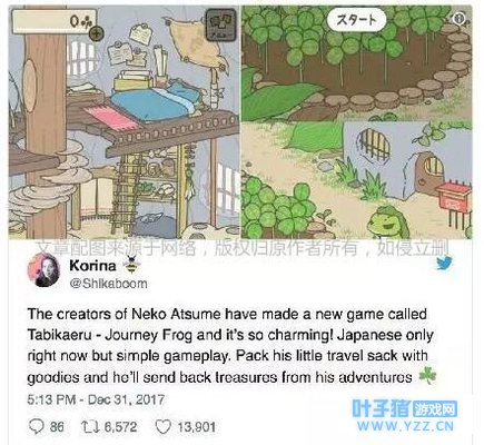 《青蛙旅行》是日本游戏公司HIT-POINT新出的一款休闲小游戏,此前这家公司还出过一款类似的养成游戏《猫咪后院》(ねこあつめ),也很受玩家喜爱。 也有人称这是一只“佛系青蛙”, 一切随缘的玩法让大家欲罢不能,自从去年12月“佛系”这个概念走红社交网络之后,越来越多的年轻人都把这个词当做了自己的标签。游戏很简单,只有院子和屋里两个场景,主角是一只小青蛙,小青蛙独自居住在一个木屋里,屋外种着一片幸运草,屋里则是木头做的小阁楼。蛙蛙不会像电子宠物一样给饭就吃,给水就喝。相反,你的蛙蛙是一只拥有独立蛙格的“佛系”青蛙,它出不出门、何时出门、何时归来,全都是随机的。