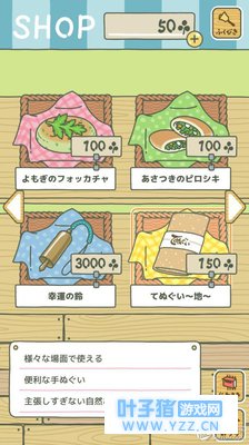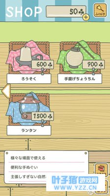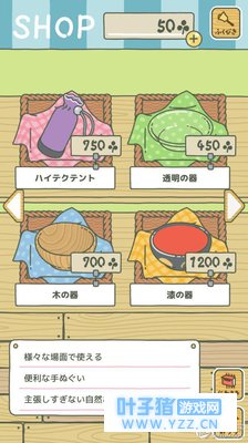 按着顺序来:按顺序: 一:食物 10颗草 野葡萄烤饼,是吃完了感觉还是有点饿就出门了。 20棵草 巨石三文治蔬菜,轻便的快餐。(中规中矩的食物) 50棵草 南瓜百吉饼。分量充足,可以去很远的地方。 80棵草 乳蛋饼,口感比较好,因为消耗很快所以会很快回家。 100棵草 艾蒿小麦饼 适合去热的地方吃 100棵草 辣葱饼, 适合去冷的地方吃 PS:食物是给青蛙出去旅行的时候吃的,是必备品,也是消耗品,吃完就没了,需要再次购买。如果不准备食物的话儿子就会离家出走!!! 并且食物不同青蛙去的地方也不同包括去的时间长久。 二:护身符 3000棵草 幸运铃铛 经济实惠,可以带来幸运并且可以重复使用。 PS:还有一种护身符是四叶草,四叶草获得方式有院子里面长,青蛙的朋友们赠送等。亲测无法重复使用。 三、道具类 150棵草 土色头巾 250棵草 木色头巾 400棵草 迷彩头巾 300棵草 入门帐篷 450棵草 标准帐篷 750棵草 专业帐篷 450棵草 玻璃碗 750棵草 木碗 1200棵草 漆碗 所有的碗青蛙好像都是当船用的。可以去海上玩 600棵草 蜡烛 900棵草 提灯 1500棵草 照明灯 各种灯,可以降低迷路的几率,适合去山洞等地方探险。如果迷路超过一天也会获得称号。