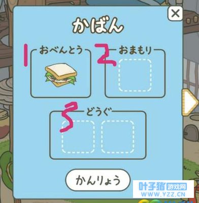 背包就是蓝色的框,是你给哇包里放的东西。 1.是便当盒 2.是护持物【四叶草和幸运符之类的】 3.是装备,可以放商店买的碗,帐篷包袱皮之类的; 下面那个按钮是完成,你放好所有要他带上的东西就可以点了,点成了灰色就可以了。 |