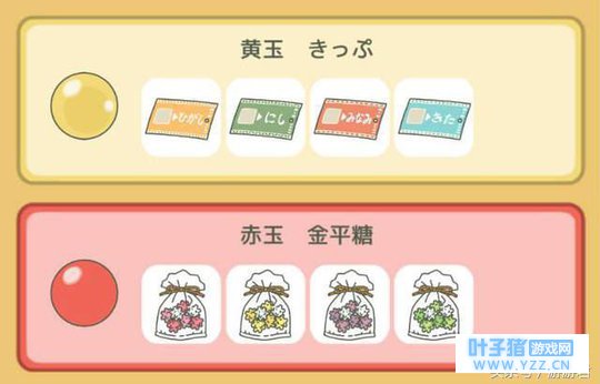 大奖是黄色「车票」颜色的不同的车票会影响蛙蛙的旅行之路,分别是东、西、南、北。再来的奖项是黄色球的「金平糖」