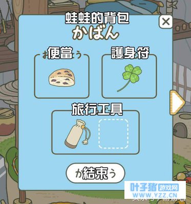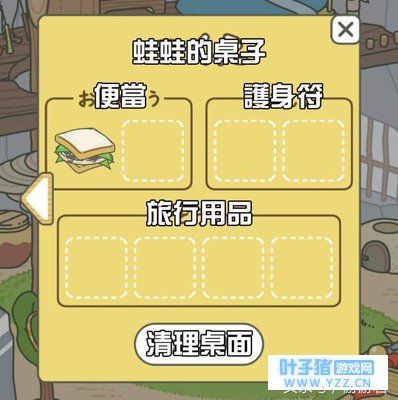 除了帮蛙蛙收拾包包之外,还可以把食物跟护身符以及旅行用品放到蛙蛙的桌上(黄色背景就是蛙蛙的桌子)当蛙蛙已经旅行回来,想要马上出去旅行时就会自己从桌子上收拾行李!下方的清理桌面按下去之后会把便当、护身符、旅行用品都收拾掉,所以如果帮蛙蛙准备好东西就不要按它(桌上要摆东西蛙蛙才会回家喔)