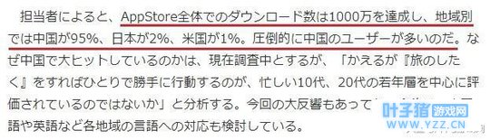 近日,《旅行青蛙》制作人上村真裕子又接受了国内某传统媒体的采访,虽然采访中未有提及国内代理事宜是否敲定,不过制作人还是对游戏机制、受欢迎原因进行了释疑,以及对外挂和盗版软件问题表态。 另外截至1月29日,《旅行青蛙》依然牢牢占据中国App Store免费总榜第一的位置,畅销榜则稳定在第16名。 同时据朝日周刊报道,Hit-Point负责人透露《旅行青蛙》在App Store已经达成千万次下载,按地区分,中日美三地分别贡献了95%、2%、1%,中国玩家占据压倒性优势。而据公开数据显示,《旅行青蛙》在Google Play上的下载则为50万到100万之间,远低于App Store。