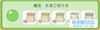 绿球(绿玉):小馒头跟金平糖一样都是食物,让蛙蛙带着的话,会提高某些小动物出现在照片中的机率,不过也有可能不会出现喔,从左至右分别是: 红萝卜小馒头(にんじんぼうろ):老鼠会比较容易出现。 南瓜小馒头(かぼちゃぼうろ):螃蟹会比较容易出现。 毛豆小馒头(えだまめぼうろ):蝴蝶会比较容易出现。 牛奶小馒头(ミルクぼうろ):随机。 牛蒡小馒头(ごぼうぼうろ):随机。