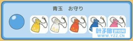 蓝球(青玉):抽到蓝球的话会获得护身符,效果是提高蛙蛙前往某个方向旅行的机率喔! 黄色护身符(黄色のお守り):会比较容易前往东部地区。 白色护身符(白色のお守り):会比较容易前往西部地区。 红色护身符(赤色のお守り):会比较容易前往南部地区。 蓝色护身符(青色のお守り):会比较容易前往北部地区。 桃色护身符(桃色のおまもり):随机地区。