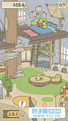 游戏界面--家里 游戏最撩人的地方就是,你根本不知道你的蛙儿子什么时候出门,去哪里玩。你只能乖乖等着。青蛙会周游日本,有时几个小时后它就回来了,有时候要四天它才会回来,你没有任何方法可以和你的蛙互动。 作为蛙的主人,你可以做的是,给你的蛙准备好食物、道具,以及护身符,这些物件可以三选一,也可以全选,如果你有足够的三叶草的话。然后蛙就会带着这些东西出门,回来的时候会给你带它的旅游照片、手信、三叶菜,有的时候它会什么都不带就自己回来了。
