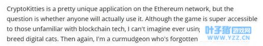 是机会,还是只是一场游戏? 不过正所谓“只见贼吃肉,不见贼挨打”,区块链云撸猫的风光背后必然存在着被“吊打”的隐患:技术层面上,《Crypto Kitties》曾经有过占据以太坊网络16%以上的交易流量的纪录,而在火爆的背后,也导致了以太坊网络不堪重负,出现严重拥堵,转账交易延迟无法到账的现象;同样,基于区块链底层平台的《加密狗》也发生过对外公布消息的一天内进入维护状态的情况。可见,这对于所有想要试水区块链游戏的开发者来说,技术升级是不得不面临的问题之一。 监管层面上,基本上所有的区块链宠物游戏,都依靠以太币作为主要的交易手段。虽然美国对虚拟货币的监管仍处在敏感的灰色地带,但我国从去年9月4日开始,多个监管部门就联合下发了《关于防范代币发行融资风险的公告》,让涉及代币、虚拟货币的各种行为都变得更加谨慎,甚至相关的比特币交易所也被强行关闭,可以说,目前以虚拟货币作为交易手段的区块链宠物游戏,很有可能在不经意间触及到法律法规的红线。 但无论怎样,正如Axiom Zen工作室设计《Crypto Kitties》之初宣称的那样,用游戏这种简单有趣的方式来普及区块链,的确接地气见效快。虽然仍有不少观点认为“云撸猫”只是开发者在硬凹概念,打着区块链的幌子造泡沫。但不得不承认随着游戏市场的不断发展,游戏内虚拟财产的安全越来越受关注,而此时的去中心化、安全、透明的区块链技术的出现,显然满足了不少游戏厂商对虚拟财产保护的迫切需求。