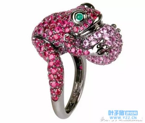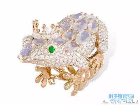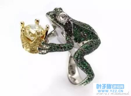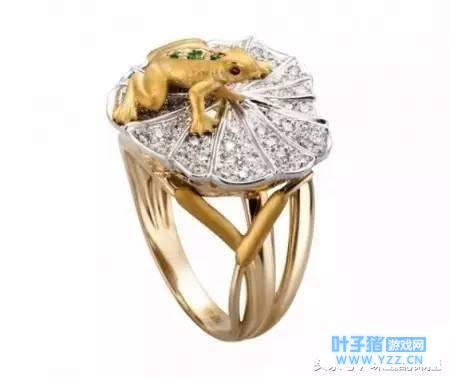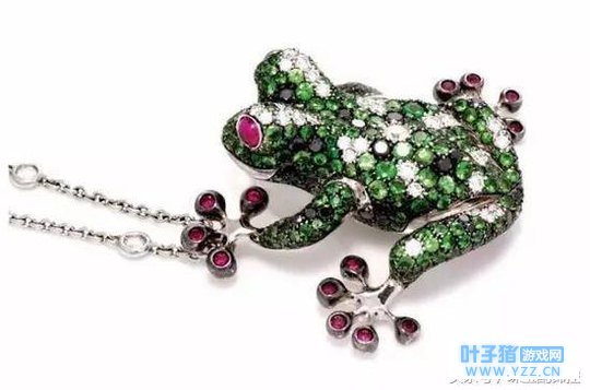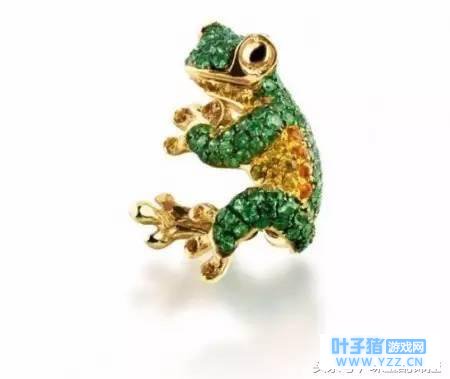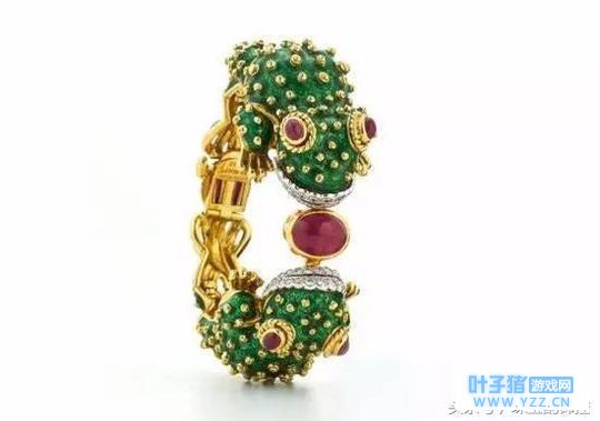 《旅行青蛙》中的主角 David Webb 的金色青蛙手镯,红宝石搭配绿色瓷釉,色彩艳丽。两只可爱的青蛙王子的嘴则用钻石镶嵌而成。