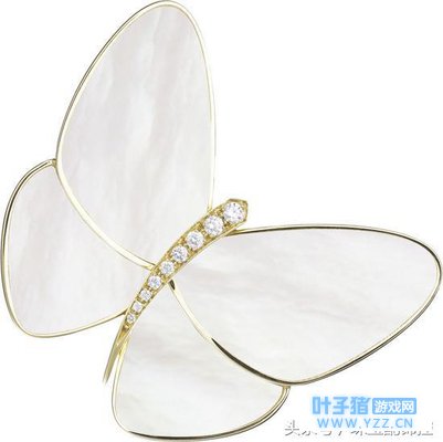 Two Butterfly系列指间戒 Van Cleef & Arpels梵克雅宝 Butterfly珍珠母贝吊坠及胸针系列蝴蝶自古以来是“美”的化身,它们总是让旁观者目眩神迷,它们细腻、优雅的美感,更是Van Cleef & Arpels梵克雅宝永恒的创作源泉。 象征优雅的珍珠母贝,据说能赐予佩戴者幸福。珍珠母贝一直被梵克雅宝选用在作品中,不仅因为其优雅的象征,更因为珍珠母贝随着不同角度,投射出缤纷光泽,象征世家无限的创意。经典的黄K金配白色珍珠母贝蝴蝶胸针、项链,或白K金配黑色珍珠母贝蝴蝶胸针,线条看似简单,但透过珍珠母贝柔和独特的柔美光泽,强调出当代女性刚柔并济的特质,让人爱不释手。 梵克雅宝仅选择来自印度尼西亚和日本的珍珠母贝,全因其颜色瑰丽、外表匀称、修饰完美。