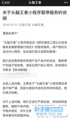 31日上午,“头脑王者”官方作出回应称,暂停服务的主要原因为题目审查不严谨,部分题目给用户带来困扰。官方称目前正在严格自查,删除不良内容,优化题目审查流程,但何时恢复服务并未提及。