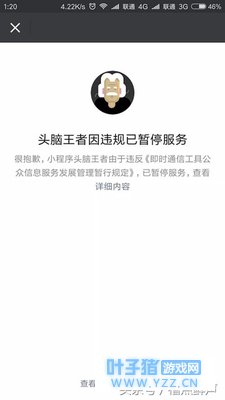 然而!30日晚间,有用户登陆“头脑王者”与好友进行PK时发现,该小程序已经暂停服务引发不少人关注。今天早上,头脑王者通过官方微信服务号说明原因……违规原因是违反了《即时通信工具公众信息服务发展管理暂行规定》。