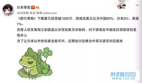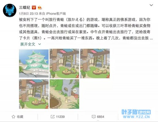 刚开始日语文化圈层的小范围推介,比如@丸猫MaruNeko在微博发布了《旅行青蛙》在国内全网的首条信息,这条微博的转发量只有412次。后来ACGN领域的一些二次元和游戏博主,也纷纷推荐这款放置游戏。 “大概就前段时间,身边朋友忽然让我帮忙翻译一款游戏的内容。”本身是学日语的小A表示,自己也是经介绍才得知《旅行青蛙》,玩起来一发不可收拾。在游戏圈内部扩散时,汉化和游戏攻略功不可没,官方没有很快推出中文版,反倒成了这个游戏的优势。